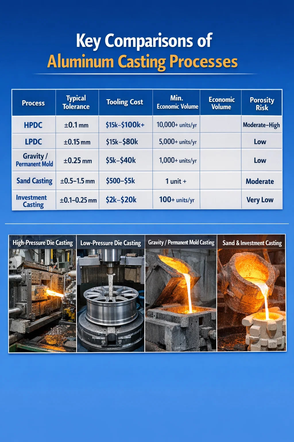 | Process | Typical Tolerance | Tooling Cost | Min. Economic Volume | Porosity Risk |