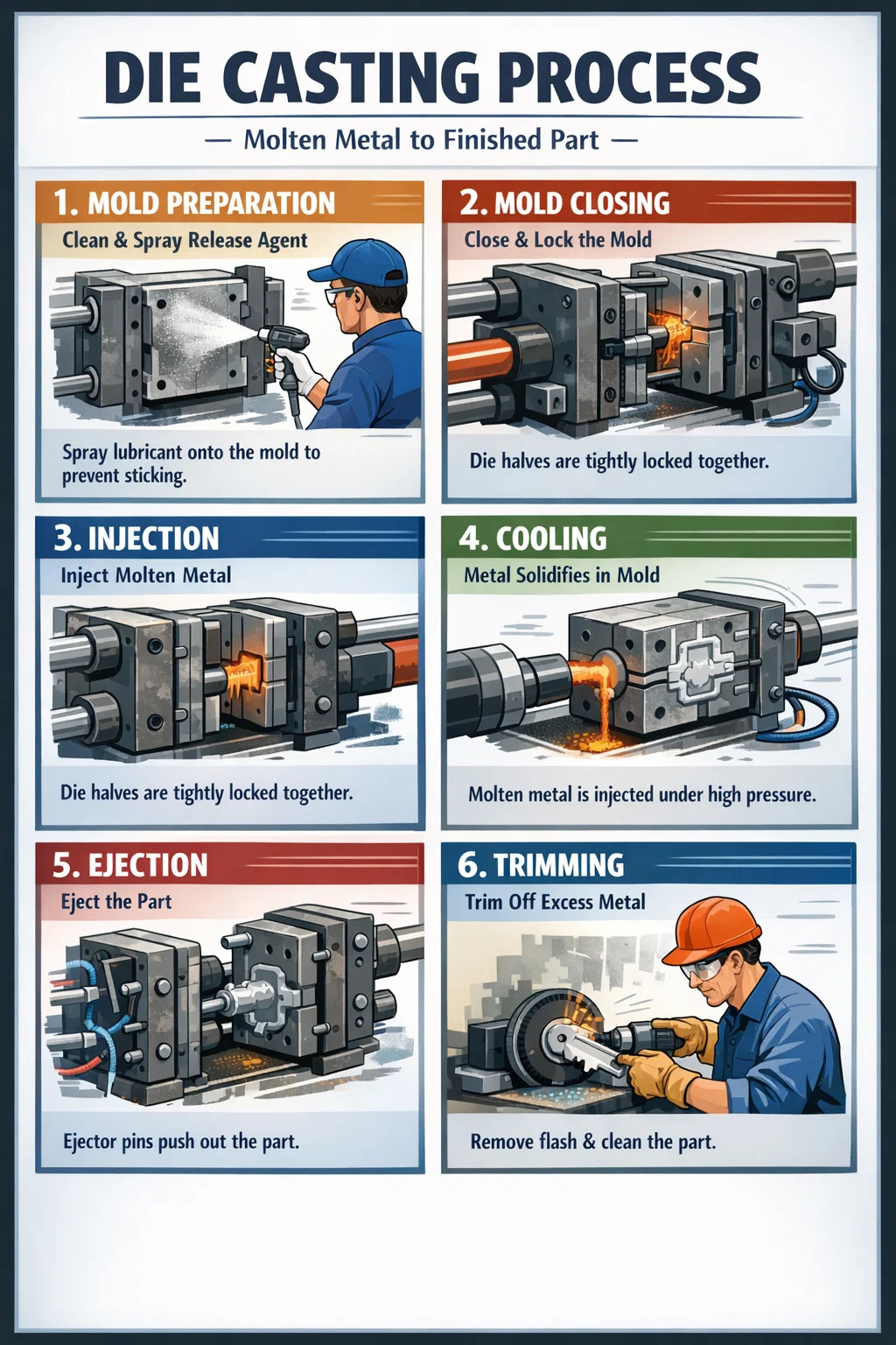 Die casting is like making "metal ice cubes" or "high-end injection molding." It's a process where molten metal is "forced" under high pressure into a precision mold, then cooled to form solid parts.