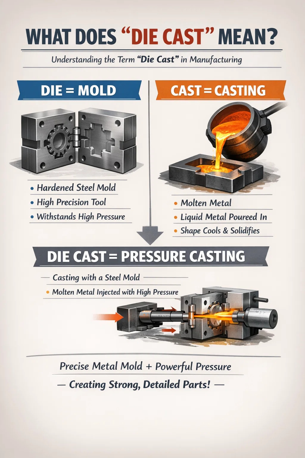 Combining these two words into "die cast," the core meaning is: pressure casting using a precise metal mold.